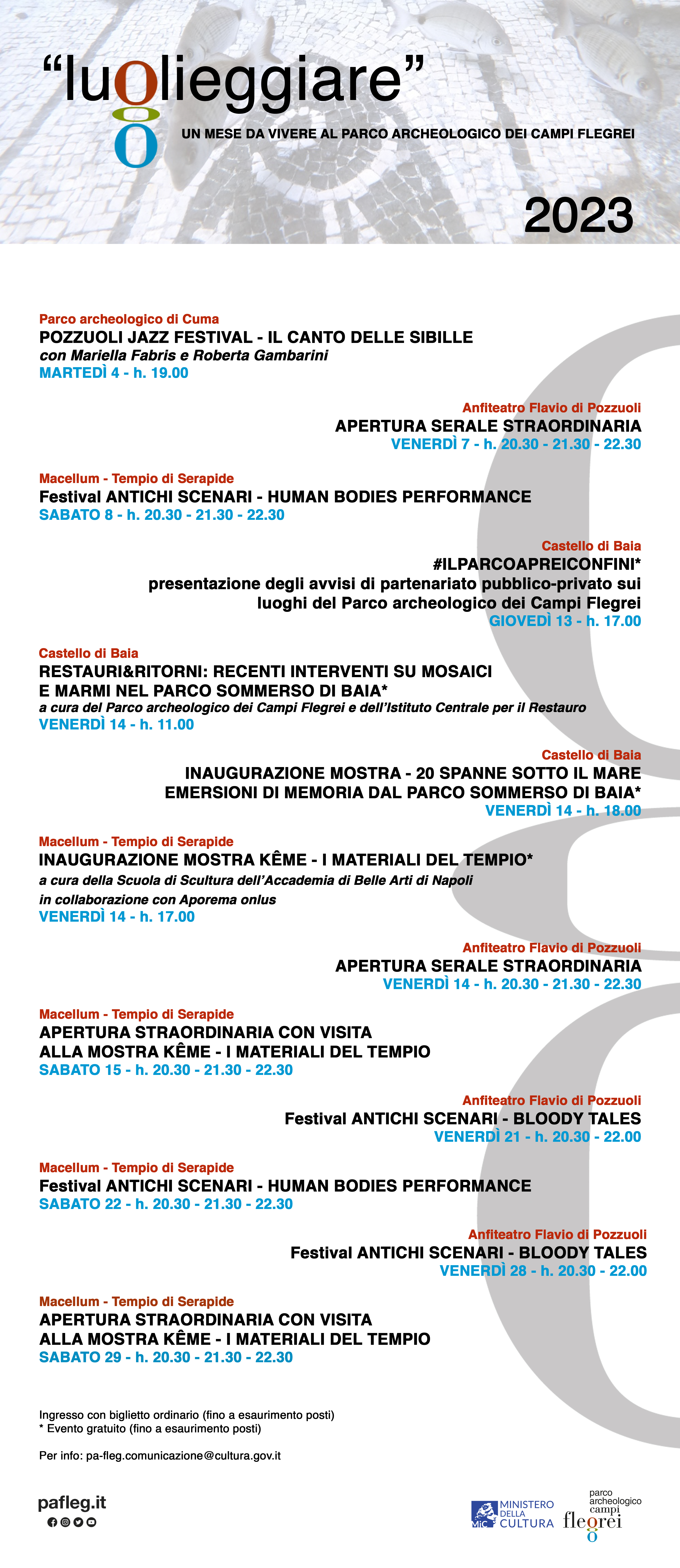 Luglieggiare si apre il 4 luglio con una esibizione al Parco archeologico di Cuma di Mariella Fabris e Roberta Gambarini dal titolo “Il canto delle Sibille”; l’esibizione si inserisce all’interno dello storico palinsesto flegreo “Pozzuoli Jazz Festival”. Due le aperture straordinarie serali dell’Anfiteatro di Pozzuoli: venerdì 7 e venerdì 14, con tre turni di visita. Sabato 8, al Macellum di Pozzuoli, prende il via il Festival “Antichi Scenari” che proseguirà all’Anfiteatro Flavio venerdì 21, ancora al Macellum sabato 22 e si concluderà all’Anfiteatro venerdì 28. Durante questi eventi il personale del Parco accompagnarà i visitatori con approfondimenti sui siti archeologici.