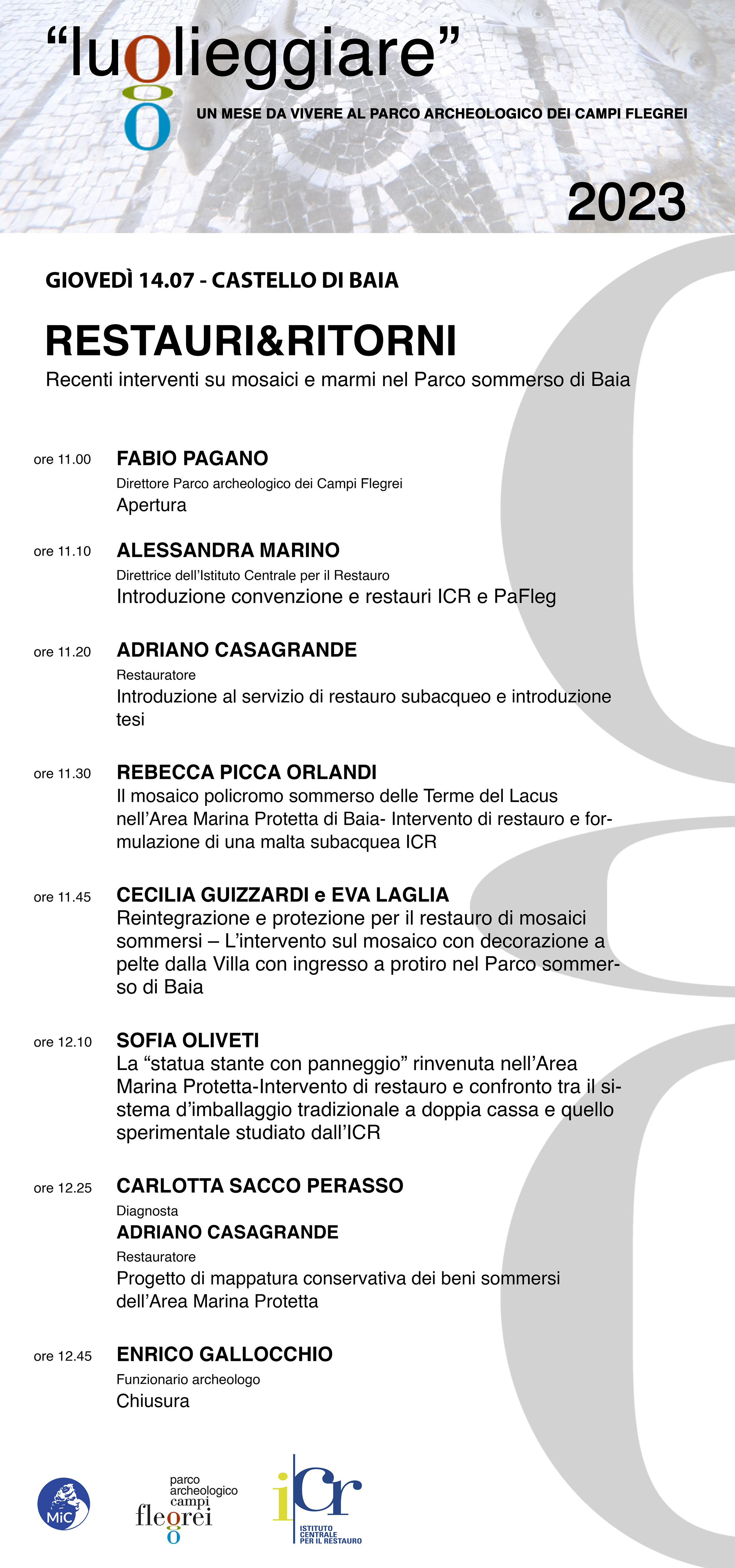 Giovedì 13 al Castello di Baia verranno presentati dal direttore del Parco Fabio Pagano i nuovi avvisi di partenariato pubblico privato per la fruizione di alcuni siti del Pafleg. Venerdì 14, sempre al Castello, l’Istituto Centrale per il restauro in collaborazione col Parco partecipa alla conferenza “Restauri&ritorni: recenti interventi su mosaici e marmi nel Parco sommerso di Baia” ( PROGRAMMA CONFERENZA QUI); seguirà l’inaugurazione della mostra “20 spanne sotto il mare. Emersioni di memoria dal Parco sommerso di Baia”, esposizione sui materiali provenienti dalle Terme del Lacus nel Parco sommerso di Baia. Nello stesso giorno al Macellum di Pozzuoli, verrà inaugurata una nuova mostra “Kemè – I materiali del Tempo” a cura della Scuola di Scrittura dell’Accademia di belle Arti di Napoli in collaborazione con Aporema Onlus. Sabato 15 e sabato 29 si terranno apertura straordinarie serali del Macellum e visita alla mostra.