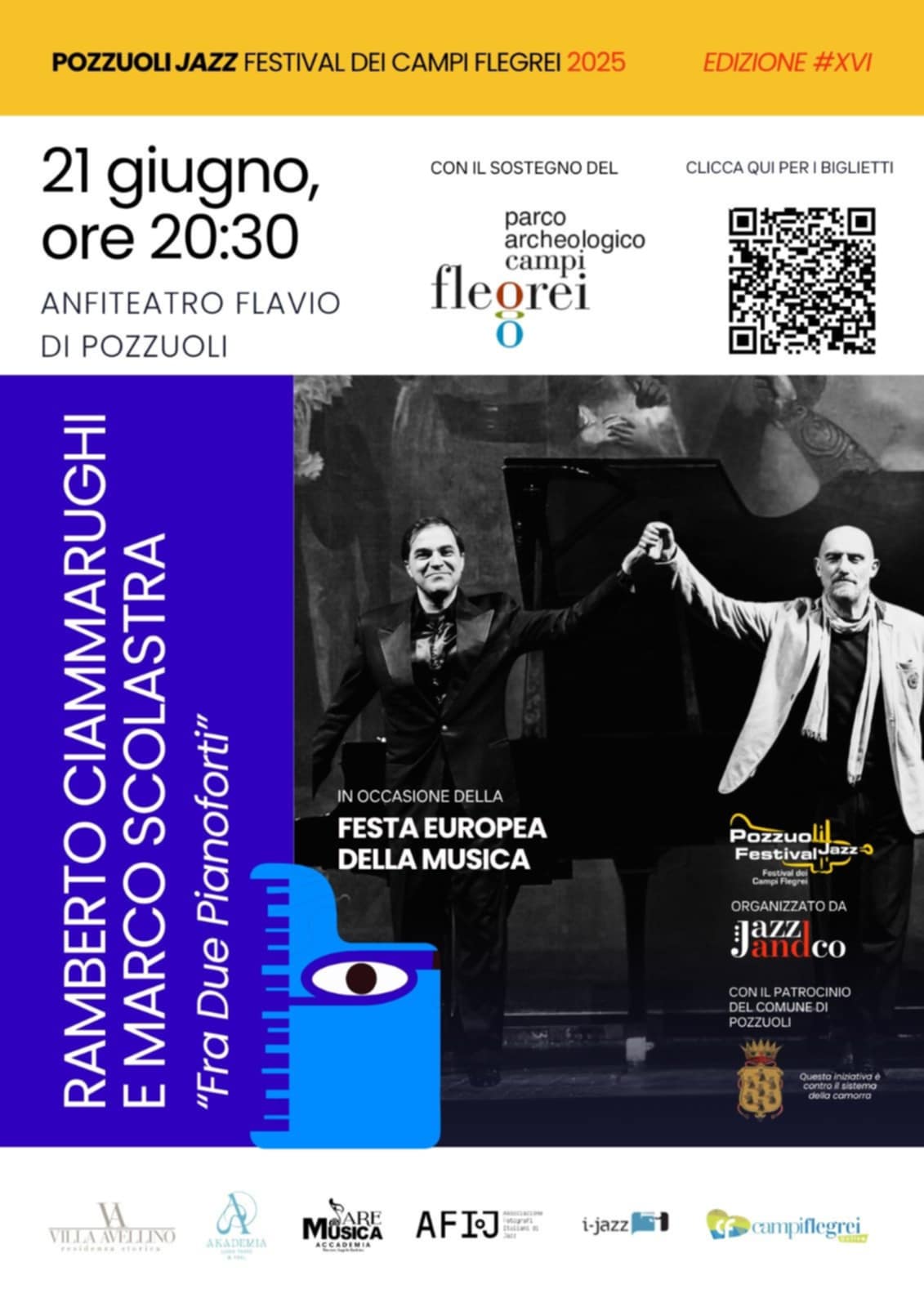 Archivio NewsSabato 21 giugno alle ore 20:30, presso l'Anfiteatro Flavio di Pozzuoli, in occasione della Festa della Musica 2025 sarà possibile assistere all'esibizione "Tra Due Pianoforti" di Ramberto Ciammarughi e Marco Scolastra.